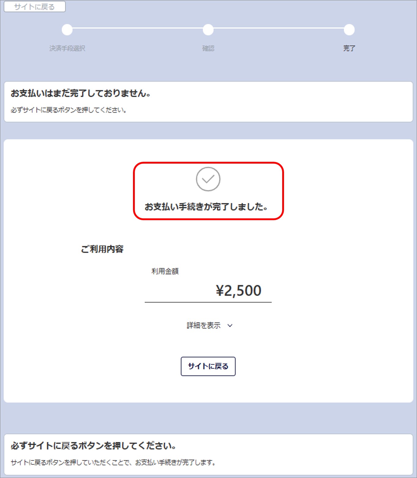 手順- 「お支払い手続きが完了しました」と画面に表示されることを確認する。