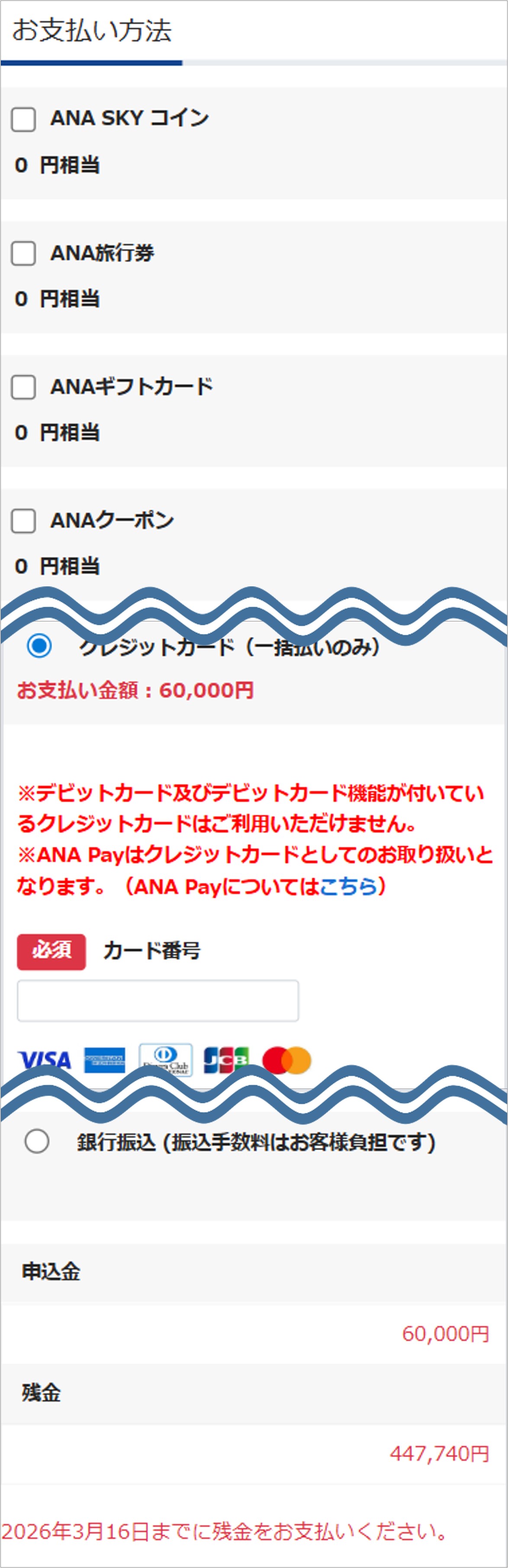 - お申し込みの時期、運賃により選択できる支払い手段が異なります。「お支払い方法について」でご確認ください。