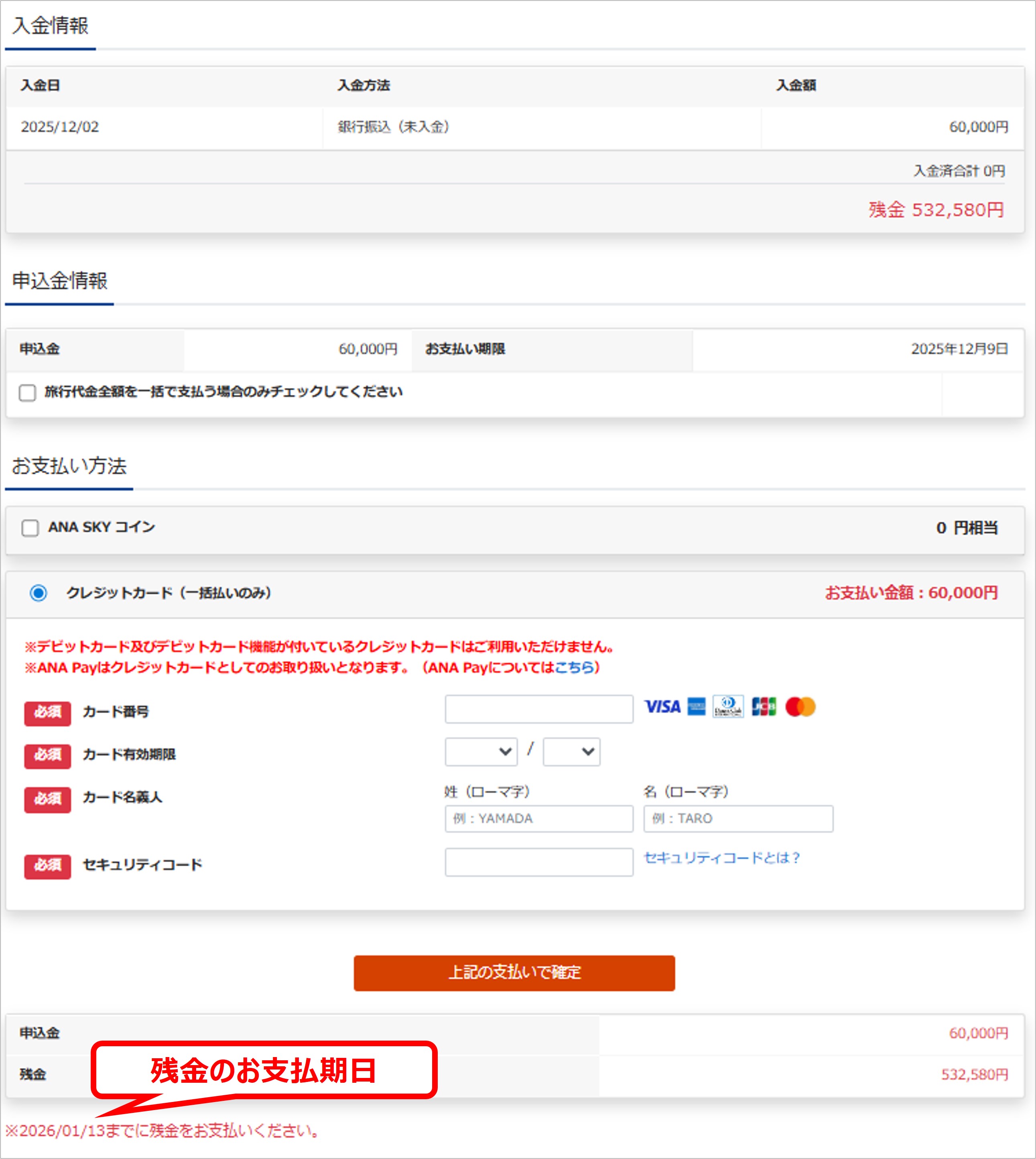 予約確認画面の残金支払期日の表示箇所は、以下画像の「残金のお支払い期日」をご参照ください。