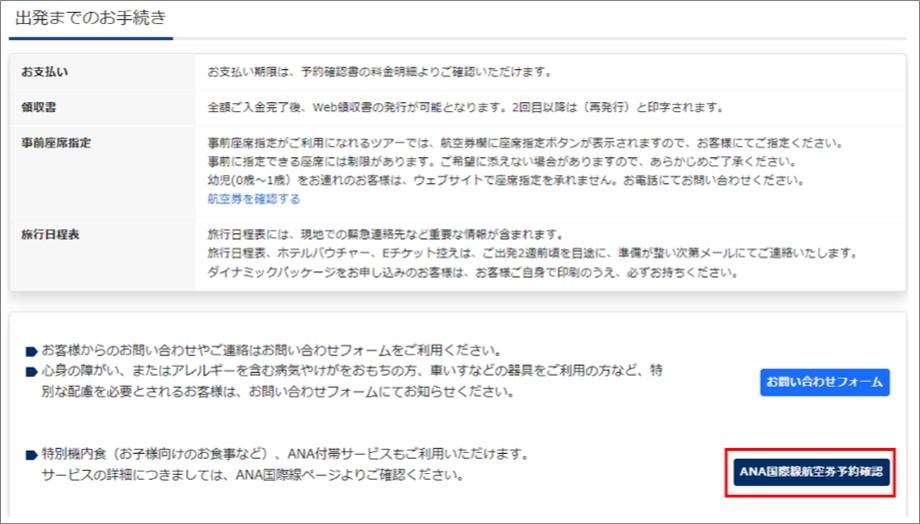 「ANA国際線航空券予約確認」をクリックし、ANA国際線ページに遷移します。