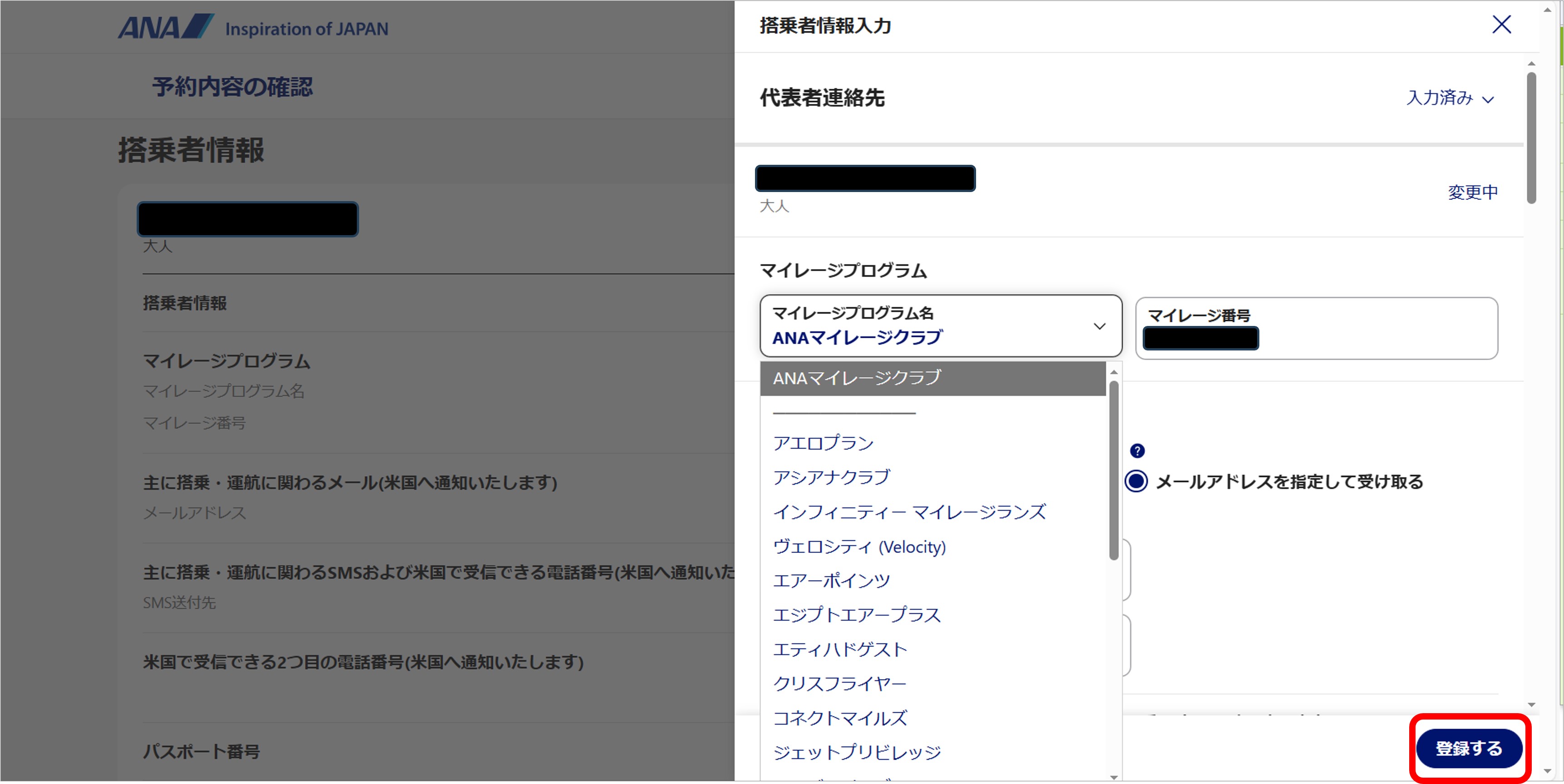 - 該当のマイレージプログラムを選択し、マイレージ番号を入力、「登録する」を押下する。
