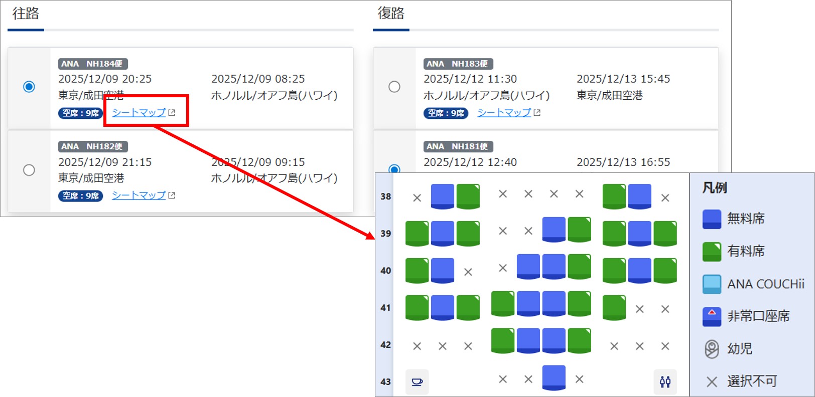 ただし、「シートマップ」をクリックすると、無料席や有料席の空き状況を確認いただけます(ANA便の場合に限ります)
