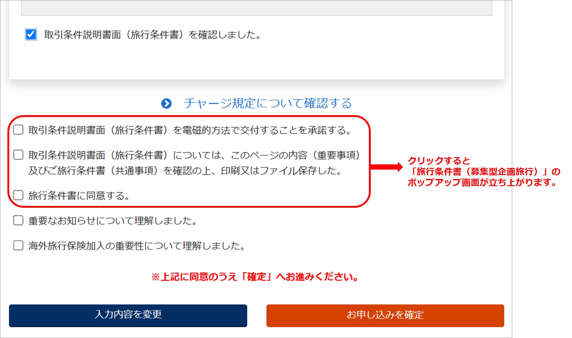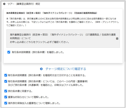 - 「旅行条件書」およびその他案内事項のチェック欄