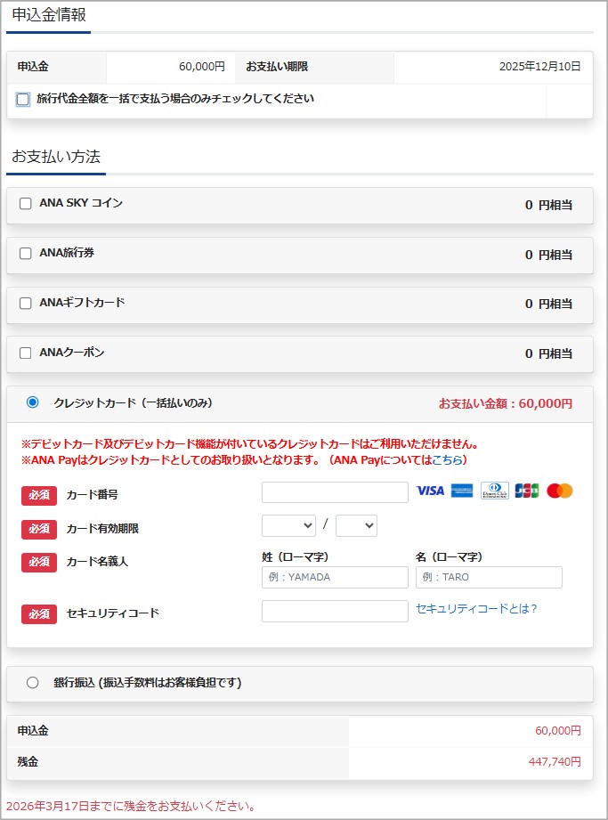 予約後のお客様氏名の変更はできませんので、入力時はパスポートと同一の情報を入力してください。 - お支払い方法の選択
