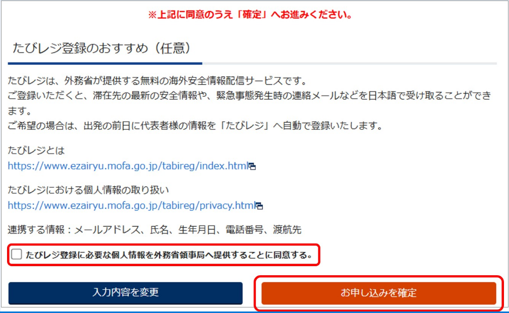 希望の場合は「たびレジ登録に必要な個人情報を外務省領事局へ提供することに同意する。」にチェックを入れる。