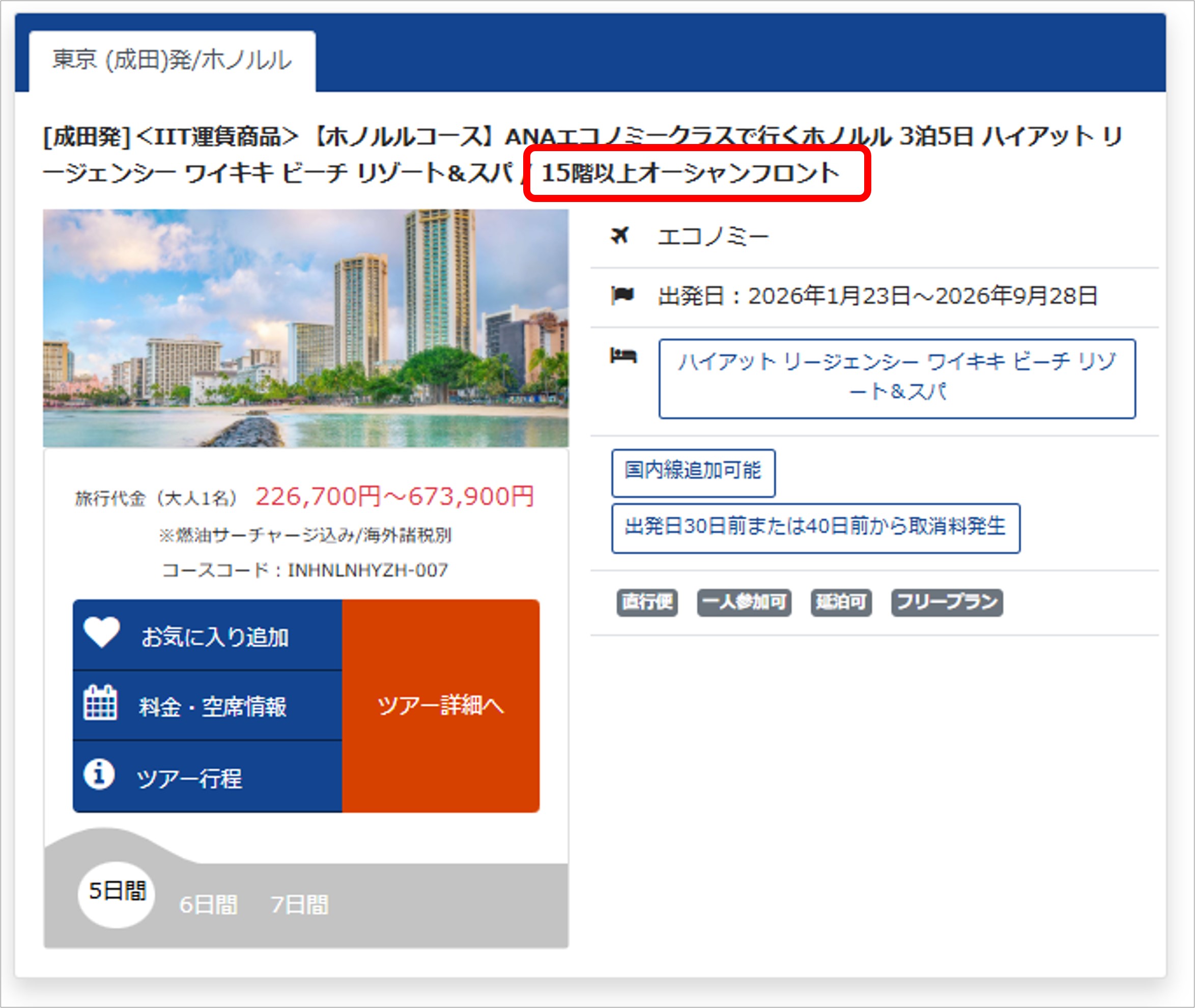 取消料規定は海外募集型企画旅行(航空券+宿泊)「海外ダイナミックパッケージ」(正規割引運賃利用商品)の「取消料」よりご確認ください。 - コースタイトルに<IIT運賃商品>と記載があるコースは、出発日の前日から起算して30日前(ピーク時40日前)から発生します。