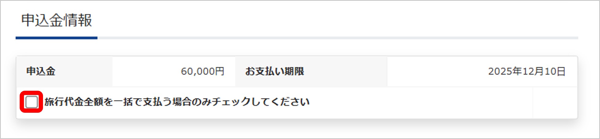 案内事項- <IIT運賃商品>で、お申し込み時点で全額一括でのお支払いを希望の際は、赤枠の欄にチェックを入れてお支払いください。